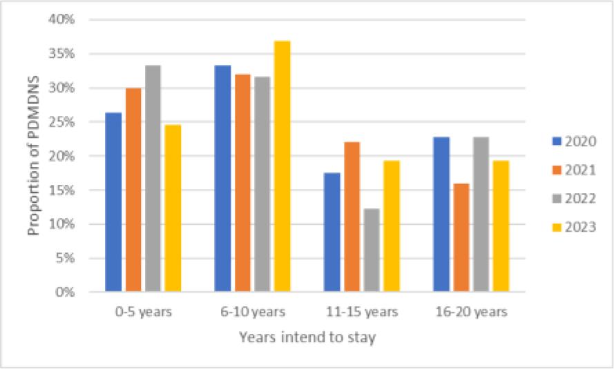 It was positive to see the growth in the number of PDMDNS planning to stay in the field for the 6-10 years and 11-15 years. The cohort intending to stay for 6-10 years has over all increased from 33% (n=19) in 2020 to 37% (n= 21) in 2023. The cohort intending to stay in the field for 11-15 years has remained relatively stable since 2020 18% (n=10) compared with 2023 19% (n=11) in 2023 despite a Dip in 2022 12% (n=7). However, there has been a decline in the number of PDMDNS planning to stay for 16-20 years 23% (n=13) in 2020 reduced to 19% (n=11) in 2023, despite an increase in 2022 23% (n=13), and the cohort intending to stay for 0-5 years. This later cohort has had the biggest decrease in between 2022 and 2023, from 33% (n=19) to 25% (n=14) but overall has remained steady 2020 26% (n=15).