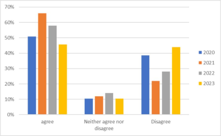 There has been a decrease in the proportion of PDMDNS who agree that their level of pay reflects their level of practice, from 51% (n=29) in 2021 to 46% (n=26) in 2023. This corresponds with an increase in the proportion of PDMDNS who disagree their level of pay reflects their level of practice, 39% (n=22) in 2021 to 44% (n=25) in 2023.