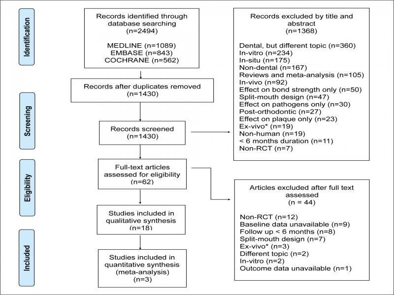 | Singh et al. (2016) | Effects of various remineralizing agents on the outcome of post-orthodontic white spot lesions (WSLs): a clinical trial | Post-orthodontic | Title/abstract screen |