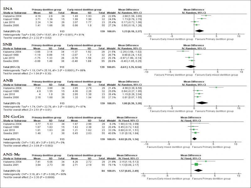 Five studies were included in the meta-analysis between the primary dentition and early mixed dentition (Figure 2). The treatment outcomes of maxillary protraction involved in the meta-analysis included SNA, SNB, ANB, SN/GoGn and ANS-Me. The treatment effect was significantly greater in the primary dentition than that produced in the early mixed dentition with respect to an increase in SNA (MD = 1.23°, 95% CI = 0.19 – 2.27, P = 0.02), ANB (MD = 1.80°, 95% CI = 0.39 – 3.20, P = 0.01), SN/GoGn (MD = 0.82°, 95% CI = 0.29 – 1.34, P = 0.002), and ANS-Me (MD = 1.57 mm, 95%CI = 0.65–2.49, P < 0.001). No significant differences were found in SNB (MD = -0.61°, 95% CI = -1.76 – 0.54, P = 0.30) between the two groups.