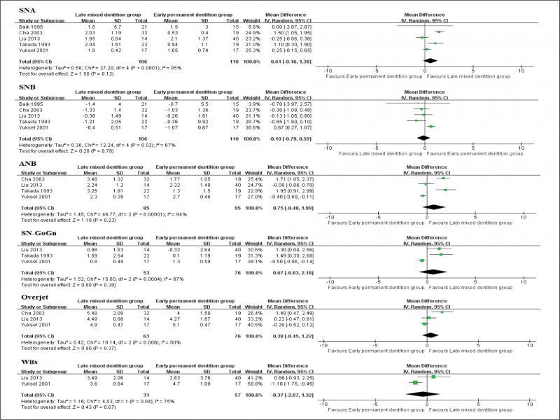 The efficacy assessment of the late mixed dentition group for Class III malocclusion versus the early permanent dentition group. The comparison was performed using six indices. 1: Angle SNA. There were no significant differences in SNA between the two groups (MD = 0.61, 95% CI = -0.16 – 1.38, P = 0.12). 2: Angle SNB. There were no significant differences in SNB between the two groups (MD =-0.10, 95% CI = -0.79 – 0.59, P = 0.78). 3: Angle ANB. There were no significant differences in ANB between the two groups (MD = 0.75, 95% CI = -0.48 – 1.99, P = 0.23). 4: SN/GoGn angle. There were no significant differences in SN/GoGn angle between the two groups (MD = 0.67, 95% CI = -0.83 – 2.18, P = 0.38). 5: overjet. There were no significant differences in overjet between the two groups (MD = 0.38, 95% CI = -0.45 – 1.22, P = 0.37). 6: Wits. There were no significant differences in Wits between the two groups (MD = -0.37, 95%CI = -2.07 – 1.32, P = 0.67).