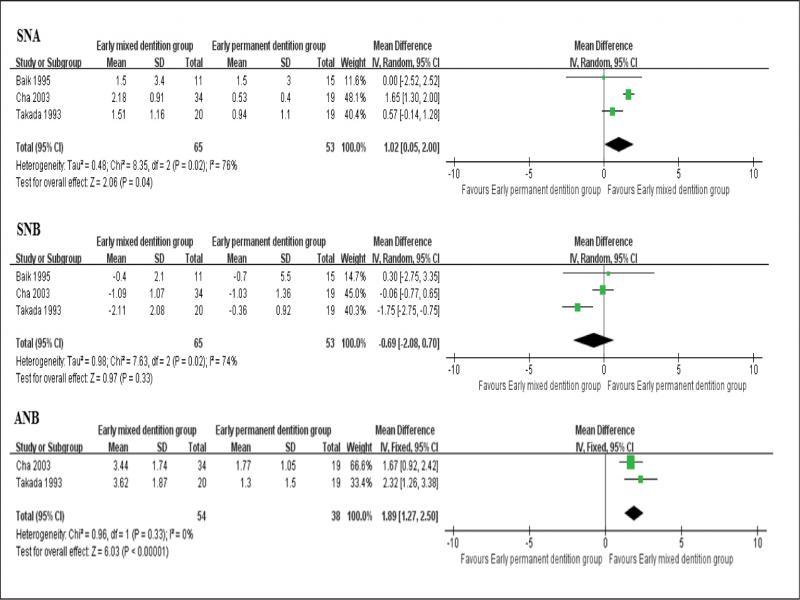 The meta-analysis included three studies conducted between the early mixed dentition and early permanent dentition (Figure 5). The treatment outcomes of maxillary protraction involved in the meta-analysis included SNA, SNB and ANB. The treatment effect was greater in the early mixed dentition than that produced in the early permanent dentition with respect to an increase in SNA (MD = 1.02°, 95% CI = 0.05 – 2.0, P = 0.04) and ANB (MD = 1.89°, 95% CI = 1.27 – 2.50, P < 0.001). No significant difference was found in SNB (MD = -0.69°, 95% CI = -2.08 – 0.70, P = 0.33) between the two groups.
