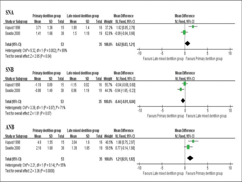 The meta-analysis included two studies conducted between the primary dentition and late mixed dentition (Figure 6). The treatment outcomes of maxillary protraction involved in the meta-analysis included SNA, SNB and ANB. The treatment effect was significantly greater in the primary dentition than that produced in the late mixed dentition with respect to an increase in SNA (MD = 0.62°, 95% CI = 0.03– 1.21, P = 0.04) and ANB (MD = 1.21°, 95% CI = 0.51 – 1.92, P < 0.001). No significant difference was found in SNB (MD = -0.44°, 95% CI = -0.91 – 0.04, P = 0.07) between the two groups.