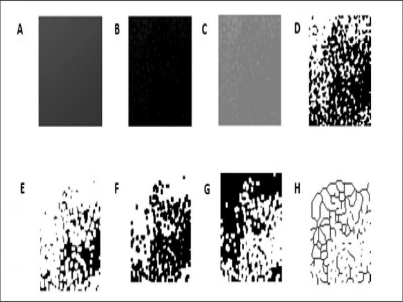 A, Filter of Gaussian blur. B, Substracted image. C, Addition of 128 gray value. D, Binarisation. E, Erosion. F, Dilatation. G, Inversion. H, Skeletonisation.