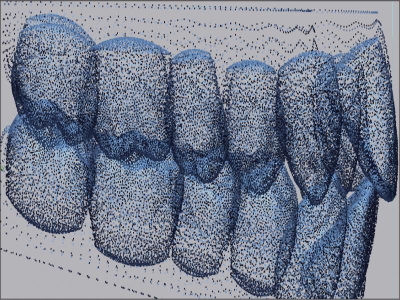 Point cloud model derived from a 3D scan showing the multiple points identified by the software on each tooth.