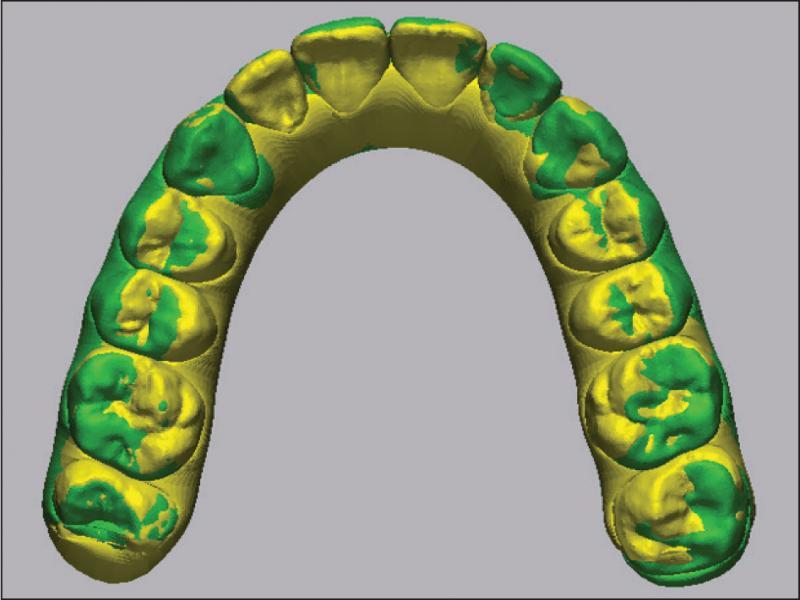Geomagic® Control X™ software identifies each tooth via the recognition of up to 1500 points on the surface of any tooth crown to generate a point cloud (Figure 1). Providing that there is no significant change to tooth morphology over the course of treatment, for example from a restoration, wear or ameloplasty, these points are recognised on any models produced during subsequent treatment stages. Models of the same arch taken at different time points can then be superimposed using Geomagic® Control X™ software to assess the precision by which the achieved outcome matched the intended outcome as prescribed using the pretreatment ClinCheck process. The superimpositions are performed in the following presented examples using the best-fit surface registration (global and fine) feature with an 80-iteration count. 6,7,19