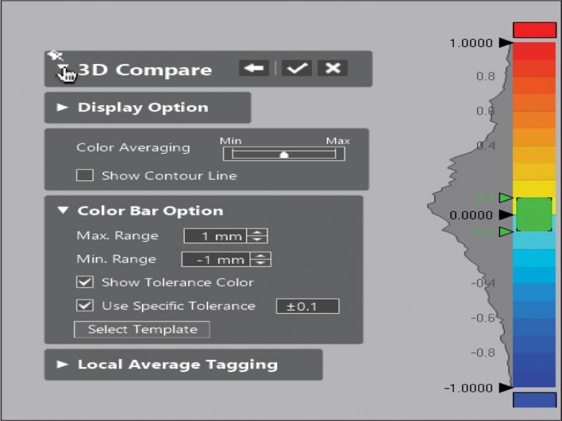 The heat map scale, showing controls that can be used to alter the scale. Current image is set to 1 mm deviation either side of ideal, with subdivisions at 0.1 mm.
