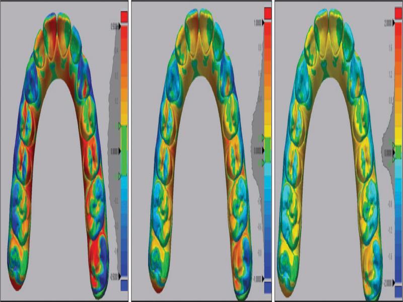 Using individual points identified on all of the tooth crowns according to the above description, the software can perform a global and best fit superimposition of the models from the same arch taken at different treatment time points. While the accuracy of this superimposition method is not yet fully quantified, it has been employed in numerous studies 6,7,19 and appears to have acceptable precision, particularly if variables such as heavy interproximal reduction or ameloplasty are excluded. Visual superimposition provides a simple overview but, owing to the nature of the models being merged into one another, accurate quantification is not possible.