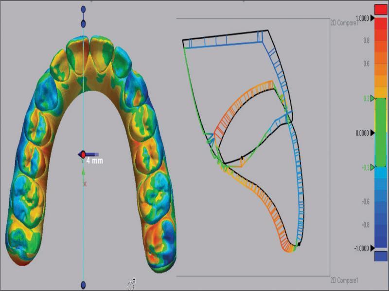 The application of 3D metrology software to assess the differences between prescribed final tooth positions and clinically achieved positions has been demonstrated and an example of its application in the assessment of a treatment outcome has been provided. The usefulness of this technology clearly exceeds the current examples, which have been used to highlight how case presentation details could be significantly improved.