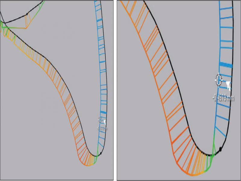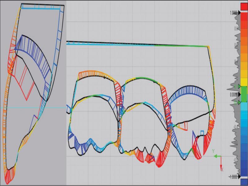 A 2D slice heat map generated in the X axis through the upper right central incisor. The reference model is in black, the measured model is coloured, depending on direction and amount of displacement. In this model the incisor crown is displaced more palatally and slightly more incisally than the prescribed position.