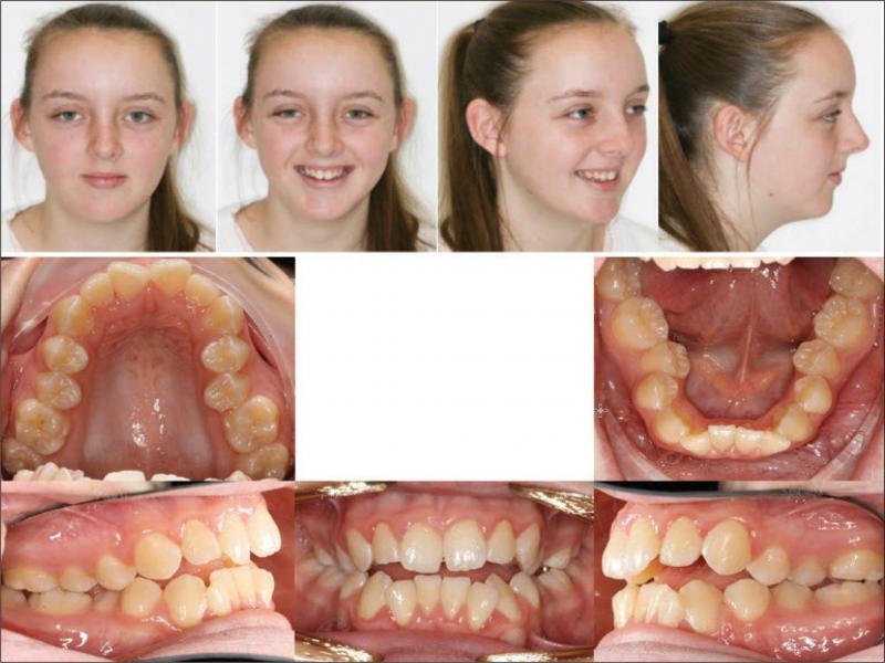 A 14-year 7-month-old Caucasian female presented to the University of Queensland postgraduate orthodontic clinic concerned about the crowding of her teeth (Figure 1). The facial appearance was asymmetric, and the profile straight but with an increased lower anterior facial height. The lips were competent, thin, and retrusive. An examination of the smile revealed consonance of the incisal edges with the lower lip, acceptable upper incisor display, coincidence of the upper dental and facial midlines, and an increased buccal corridor width and reduced posterior tooth display. Her dental malocclusion was characterised by a mild Class III buccal segment relationship with moderate to severe upper and lower crowding, an anterior open bite of 2 mm, an overjet of 6.8 mm, and tapered, lingually inclined buccal segments. All teeth were present, and a Bolton’s mandibular excess of 1.4 mm (3-3) and 2.9 mm (6-6) was noted.