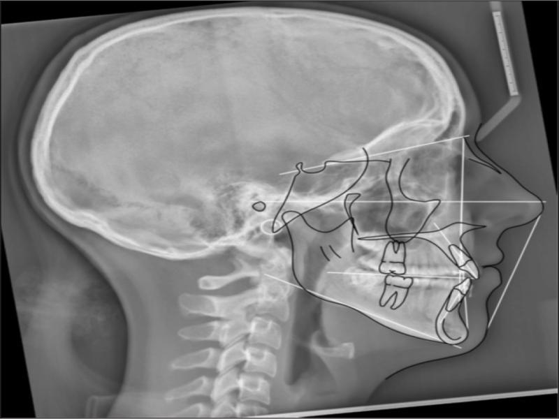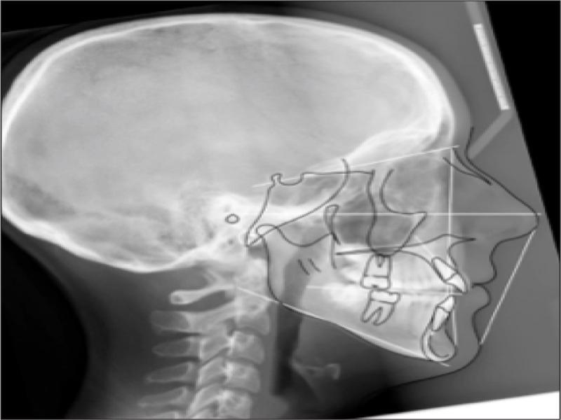 A radiographic examination was unremarkable on the OPG (Figure 2). Cephalometrically (Figure 3, Table I) a Class III skeletal relationship was evident, with a Wits discrepancy of -2.1 mm (due primarily to maxillary retrusion – SNA 72.6°). However, the Class III was camouflaged by the significant vertical disproportion, highlighted by an increased mandibular plane angle (28.6°), reduced facial axis angle (83.2°), reduced Jarabak’s ratio (56.5%), and increased lower anterior facial height (53.4%), all of which indicated a dolichofacial pattern. The maxillary retrusion, combined with a mandibular downward and backward rotation, resulted in a bimaxillary retrusive skeletal relationship (SNB 72.6°). The upper incisors were at an acceptable angulation relative to the palatal plane (112°) and the anteroposterior position relative to Na-Vert. The lower incisors were at an acceptable position relative to APo but were retroclined relative to the mandibular plane (80.7°) according to mesofacial norms.