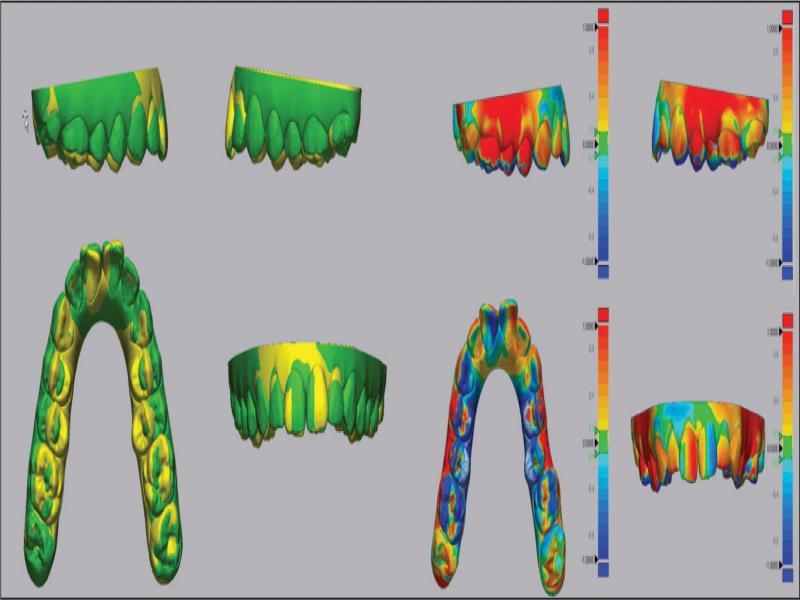 A noteworthy feature of this case was the ability to use three-dimensional superimposition and metrology software (Geomagic Control X; Figures 12–14) to assess the precision by which the achieved outcome matched the intended outcome as prescribed using the ClinCheck® program prior to treatment. The superimpositions were performed using the best-fit surface registration (global and fine) feature with a 25-iteration count. 14 The superimposed .stl files demonstrated only minor variations in the three dimensions between the intended and achieved outcome. This shows that aligner wear, supported by the appropriate use of auxiliaries, can precisely achieve a prescribed outcome. Excellent agreement between .stl files was shown in the three planes of space and for tooth alignment. The software also generates heat maps that are displayed at a maximum 1 mm resolution. The red end of the scale indicates tooth position that is moving out of or away from a reference model, while the blue end of the spectrum indicates a tooth that is moving into a reference model. The heatmaps derived from the superimposition of the initial and predicted models are of limited use, as any movement greater than 1mm is simply shown as solid red or solid blue, depending on the direction of movement. In addition, there was no fine discrimination beyond the selected 1 mm scale. While an alteration of the scale is possible, it causes a loss of discrimination at the fine end of the scale. Heatmaps, therefore, are considered more useful when comparing the predicted model to the achieved model, in which the majority of movements could be expected to have tracked reasonably closely, in addition to those which are not readily identifiable. In the current case, the example of the 37 and 36 is illustrative, as these teeth exhibited colours indicative of a discrepancy of 1 mm or greater from the predicted outcome. A more detailed analysis of individual tooth movement shortfalls is possible using this software, and a paper outlining the applications of this technology in more detail has been submitted for publication.