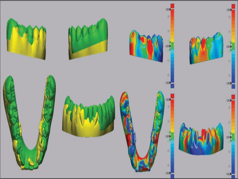 Mandibular arch .stl superimpositions. Yellow – Initial .stl, Green – Final Outcome .stl and Heat Maps (scale is 1 mm, reference model is the Initial .stl).