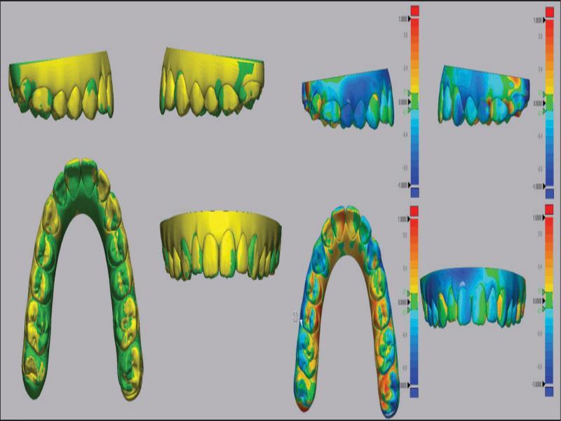 Heat map definition: Scale is 1 mm either side of ideal, in 0.1 mm gradations. Deviations that are moving out of or away from the reference model are towards the red end of the spectrum. Deviations that are moving into the reference model are towards the blue end of the spectrum. All deviations greater than 1 mm are recorded as either solid red or solid blue.