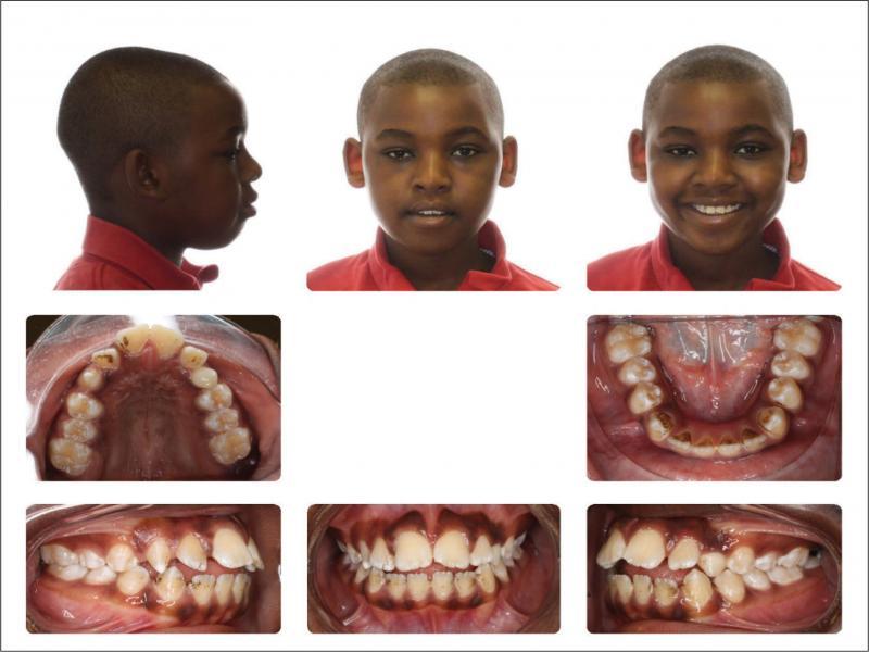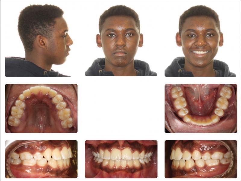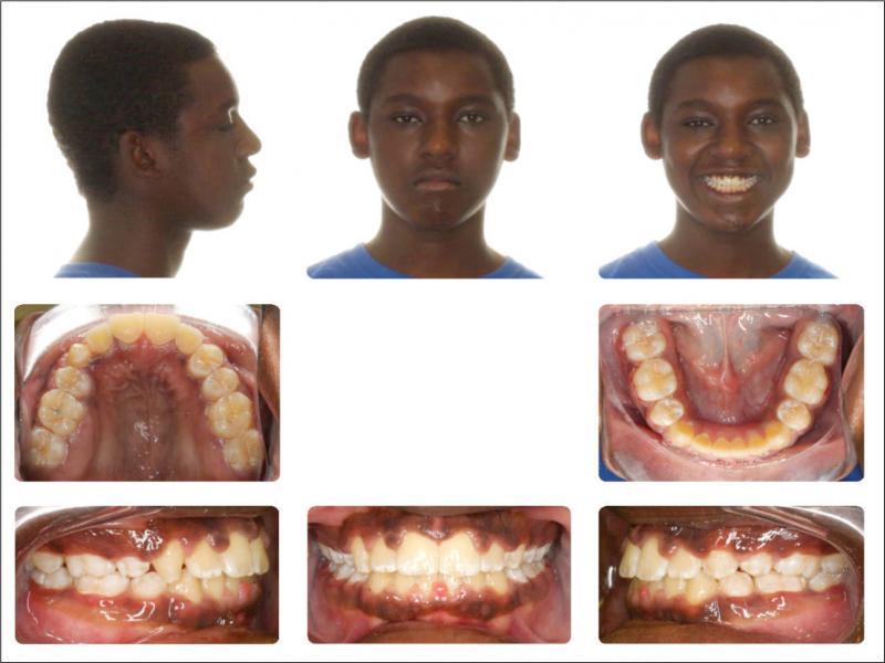 A 12-year-old African American male in good general health presented with the chief complaint of “I don’t like my upper front teeth”. An extra-oral examination revealed a convex soft tissue profile, an obtuse nasolabial angle, and lips that were protruded and incompetent. Upon intraoral examination, the patient had tooth staining, a retained deciduous upper left canine, a malformed upper right canine, a Class I molar relationship, spacing, an increased overjet and an anterior open bite (Figure 1). A radiographic examination revealed a congenitally missing upper left canine, an upper right permanent canine with a long root, an upper right first premolar with a short root, proclined and protruded upper and lower incisors and a high mandibular plane angle (Figures 2 and 3; Table I).