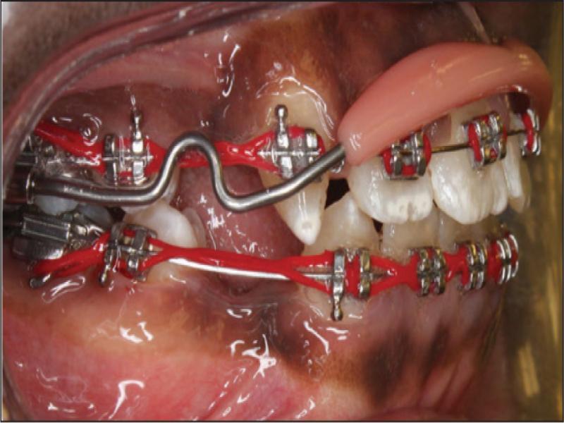 A prefabricated upper lip bumper inserted to reinforce the upper anchorage during upper right canine retraction due to its long root.