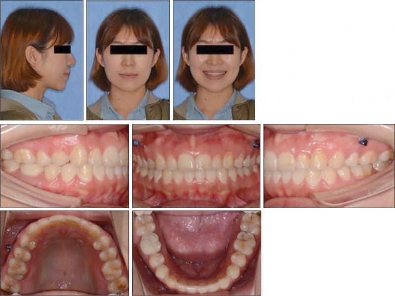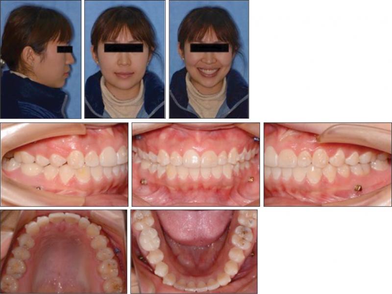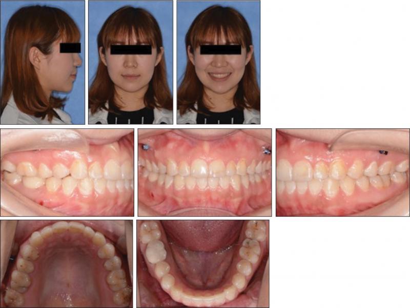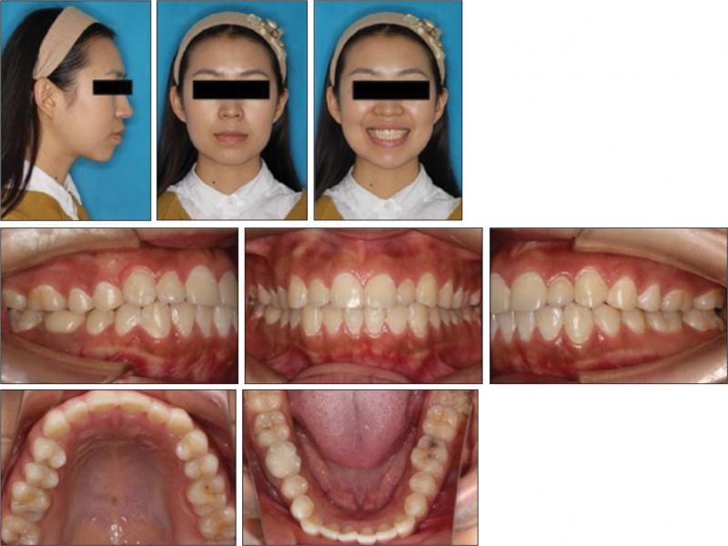 The post-treatment examination demonstrated that the treatment objectives were achieved (Figures 6 and 7). The facial photographs showed an improved profile and an aesthetic smile (Figure 6). The panoramic radiograph showed paralleled roots with no significant root resorption or alveolar bone recession (Figure 9).