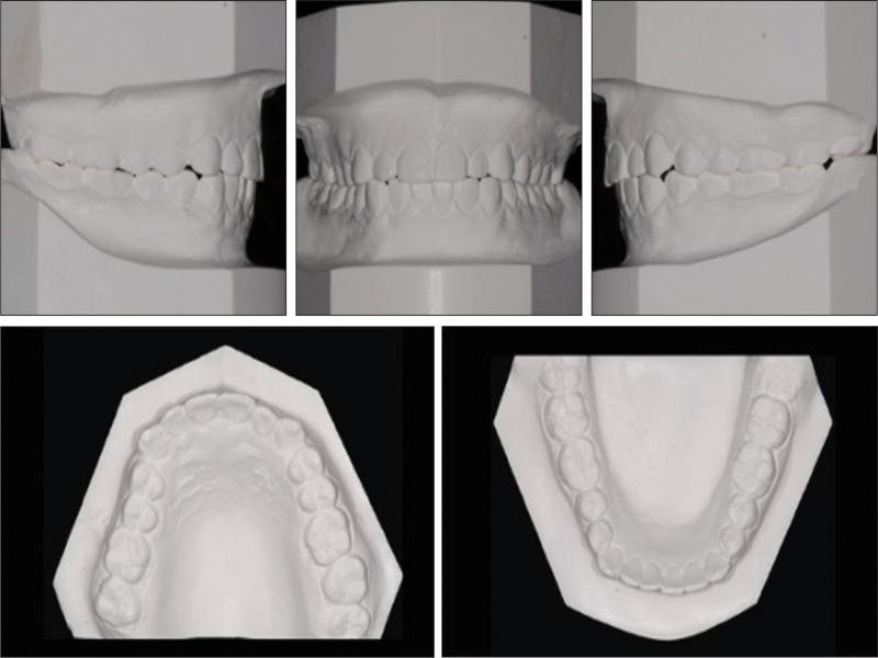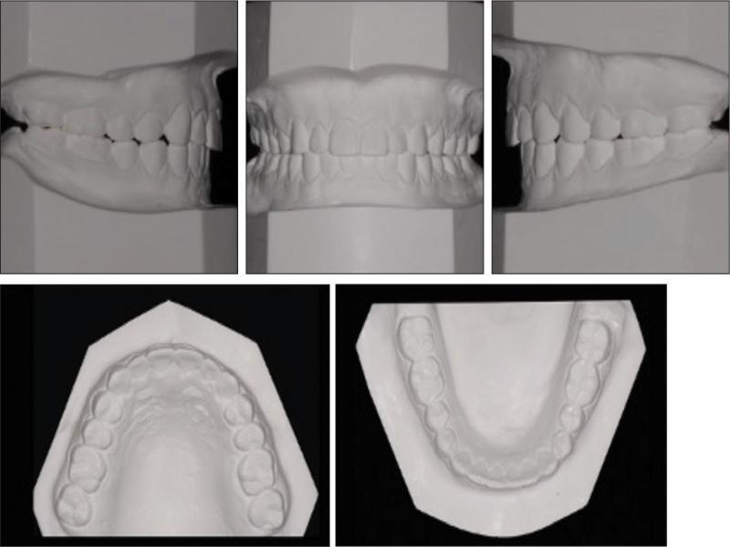 A 22-year-old female presented with the main complaint of “protrusive lips” and said she “would like to have treatment with clear aligners” because of her work as an actress. A facial analysis showed that there was a symmetrical face, a convex profile and a decreased nasolabial angle (Figure 1). No temporomandibular joint disorder was noted during the consultation and clinical examination. An intraoral assessment revealed that there was an Angle Class I molar relationship on her left side and a Class III relationship on the right side, a 1 mm overjet and overbite, and symmetrical dental arches with no crowding. Both upper and lower midlines were 1 mm to the left of the facial midline. No mandibular functional shift was observed (Figures 1 and 2).