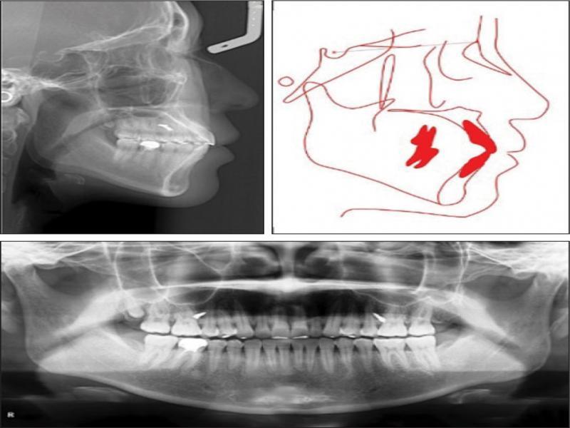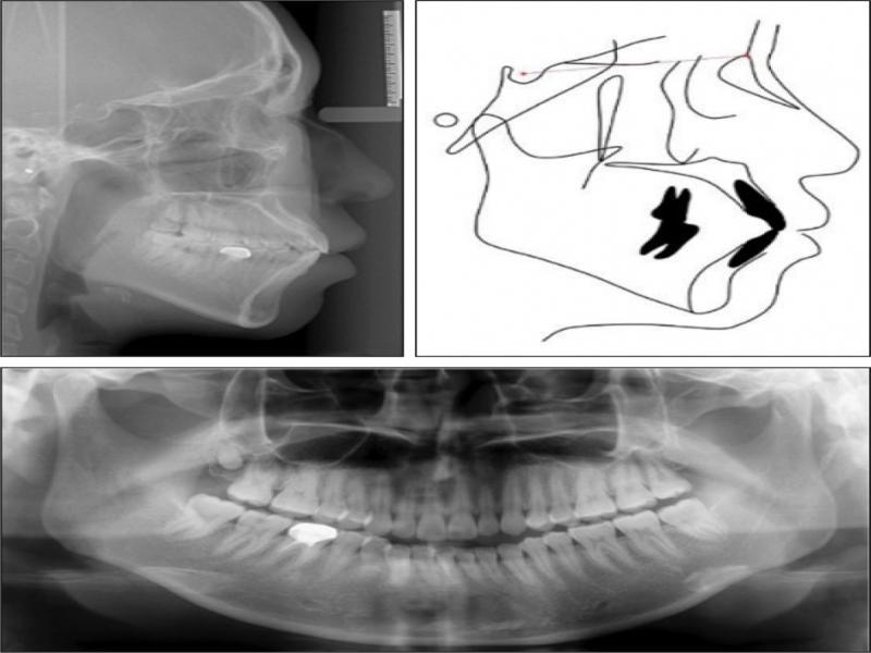Post-treatment cephalometric radiograph (top left) and tracing (top right) and panoramic radiograph (bottom).