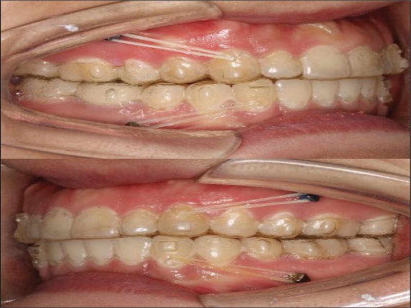 Intraoral photographs showing the elastics running from the precision-cuts to the miniscrews.