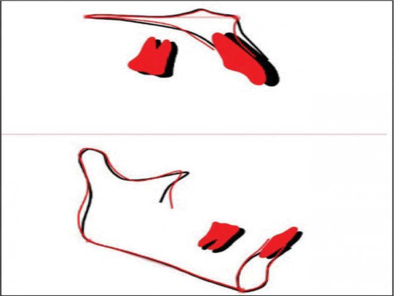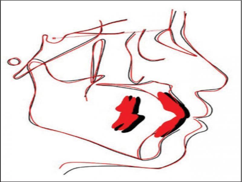Superimposition of the pretreatment (black line) and post-treatment (red line) cephalometric radiographs (maxilla and mandible alone).