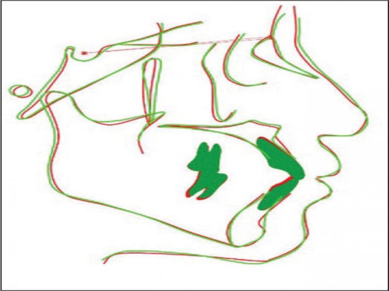 Superimposition of the post-treatment (red line) and the 1.5-year retention (green line) cephalometric radiographs.