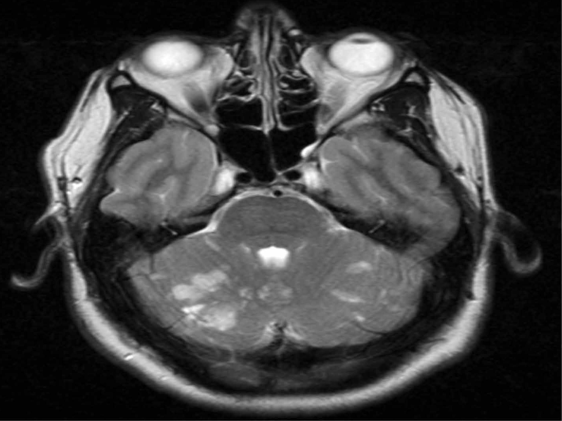 He was admitted to hospital and underwent a CT scan, which found multiple infarcts, cerebellar hemispheres and vermis. An MRI/MRA (see Figure 1) found multiple areas of acute infarction in cerebellum bilaterally and a small area of infarction in the left thalamus and occiput. There was no brainstem infarction and no infarction in any area supplied by the carotids. The MRA found thrombus in the left posterior cerebral artery (fairly distal). No other abnormalities in the intracranial arteries or neck arteries were found.