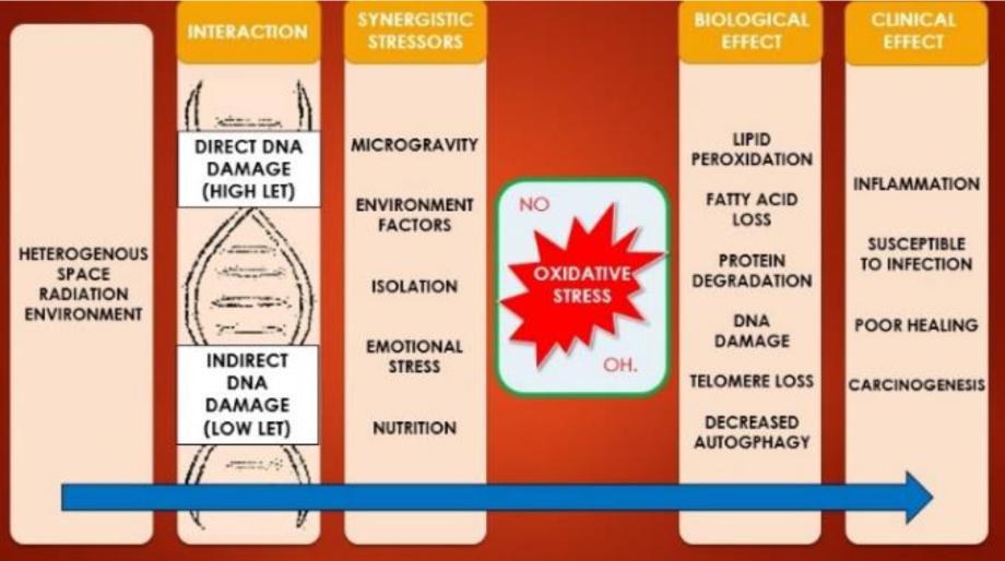 Synergistic factors exist in space that may increase damage caused by radiation. The addition of microgravity, environmental factors, isolation, emotional stress and nutrition may lead to increase cellular oxidative stress. For astronauts, this may result in inflammation, susceptibility to infection, poor healing and carcinogenesis. (Figure 1). Reactivation of Epstein-Barr, Varicella-Zoster and cytomegalovirus has been demonstrated in astronauts during short space flight being attributed to changes in immune state (11). Emotional stress on-board long confined space flights may play a role in cellular response to cosmic radiation. Increased DNA damage in peripheral blood lymphocytes has been observed following gamma irradiation in psychologically stressed subjects compared with control subjects (12)