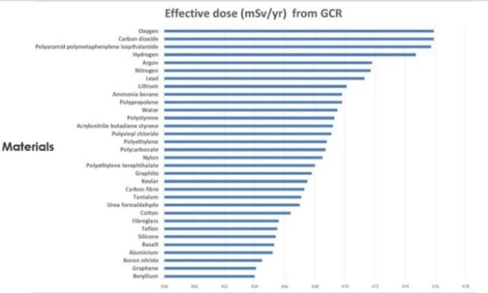 Research on-board the International Space Station has shown equivalence of Kevlar compared with polyethylene in terms of shielding ability against GCR. (6). The findings from our research reflect observations that graphite performs favourably as a shielding material against GCR on Mars.