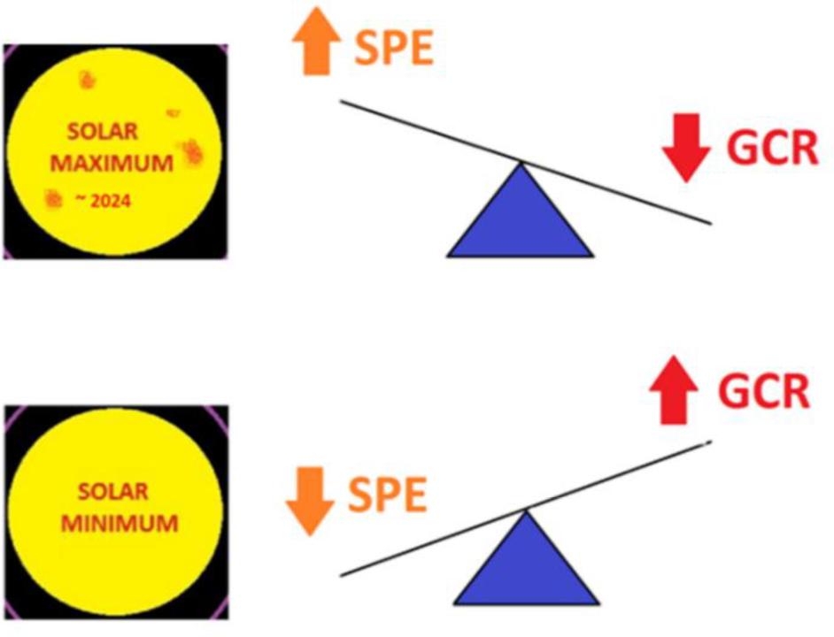 Balancing radiation dose from SPE and GCR during solar maximum and minimum. During solar maximum GCR is likely to contribute less radiation dose with an increase in frequency of SPE. During solar minimum there is likely increased dose due to GCR and less frequency of SPE.