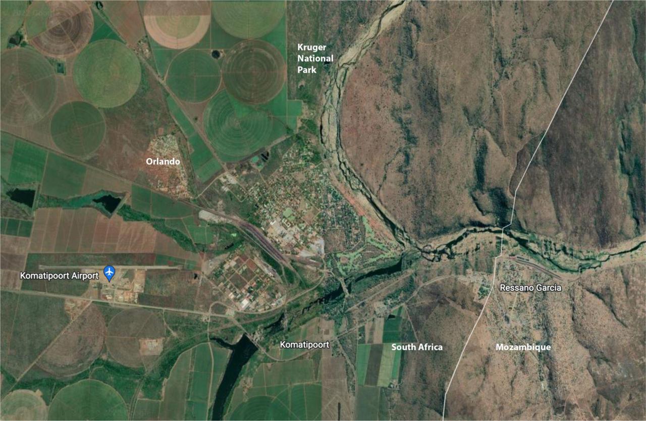Map showing the town of Komatipoort, noting the Orlando Township adjacent to Komatipoort, as well as the southern border of Kruger National Park and the South Africa-Mozambique border. Source: Google Earth (Accessed: 24 April 2022).