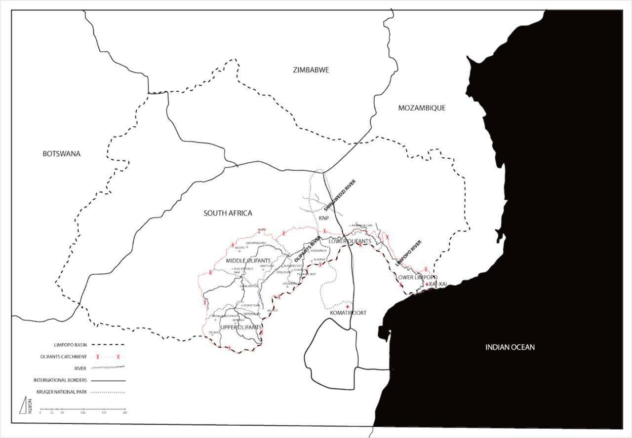 Hydrological boundaries showing the Limpopo Basin and the Olifants River and Catchment. By the Authors. Source for base map: Limpopo Basin Curriculum Innovation Network (2018a; 2018b).