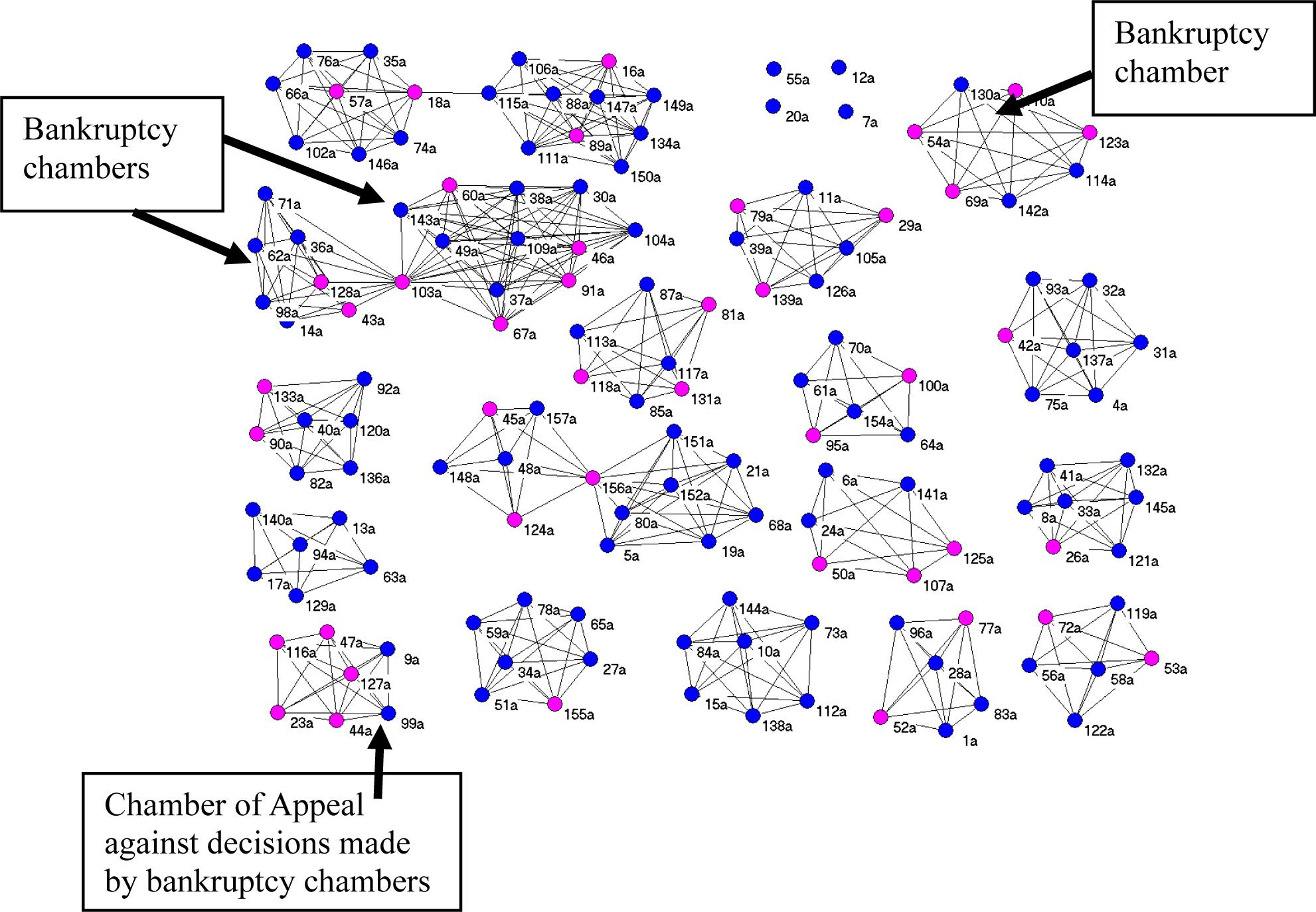 This court has a strong formal organization, with a rule that judges rotate each year around its carrousel of 20 chambers. We have used the metaphor of the spinning top to model the combination of these organized mobilities (rotation) and emergence of a pecking order in the dynamics of the advice networks among all these judges (Lazega, Lemercier, Mounier, 2006). High-status inconsistency is obvious and conflicts of interests are institutionalized (Lazega & Mounier, 2012), as shown by the composition of the chambers in this court in 2000, illustrated by Figure 1. In this figure, bankers are in pink. Banks are the main creditors in the economy; the very simple fact that so many bankers sit in bankruptcy chambers illustrates the level of institutional capture.