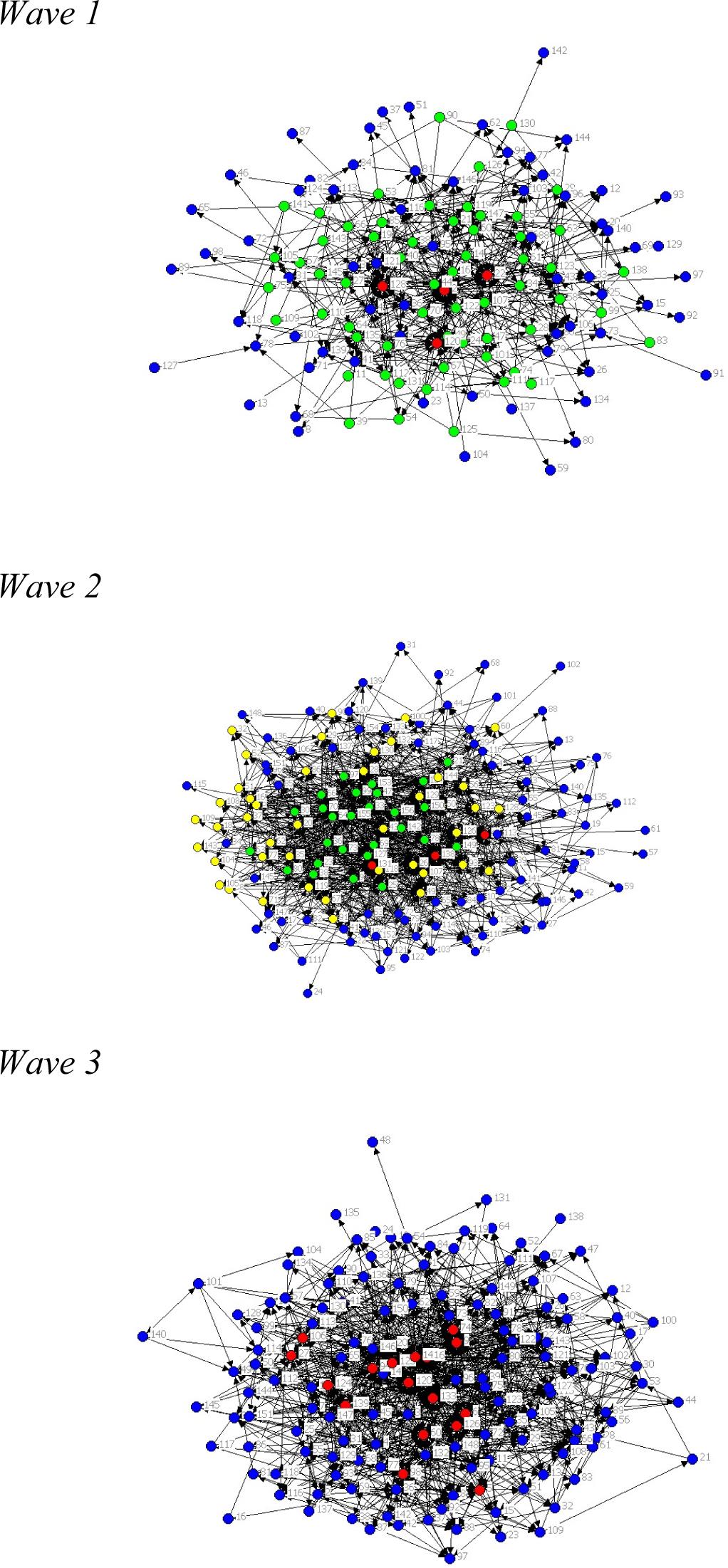 The three figures visualize the cyclical dynamics (centralization-decentralization-recentralization) of status in the advice network among the judges in the court. Core, semi-peripheries and periphery identified with Snijders & Nowicki’s (1997) stochastic blockmodelling. Source: Lazega, Sapulete & Mounier (2011).