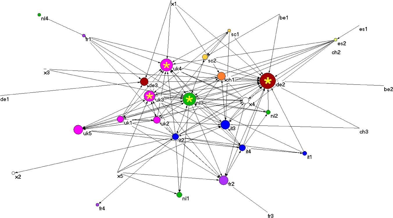 Prodded and assembled by the corporate lawyers and by EPO, activist European IP judges started to network and convene at the so-called Venice Forum, a field-configuring event, to lobby for the construction of this European court and work together on harmonizing their interpretations by hammering out a ‘European Compromise’. Where governments failed, a small collegial oligarchy of super-central judges emerges from these events and is poised to create the new European IP regime. This collegial oligarchy of judges is perceived by their peers as primi inter pares who should sit on the future Court of Appeal of the UPC and make decisions that will create a common jurisprudence. Three different networks of European judges were measured at the Venice Forum: the network of national and foreign peers (present at the Venice Forum) with whom judges personally discussed patent issues; the network of national and foreign peers whose decisions they read; and the network of national and foreign peers whose decisions they had actually cited at least once in their own decisions. Figures 3.1 to 3.4 identify the most central high-status inconsistency Venice Forum judges assembled in a ‘conclave’(8), or collegial oligarchy that was both central in the three networks of transnational social exchanges observed among these judges at the Venice Forum, and in a fourth network of judges considered to be representatives of the future uniform position about patents in Europe (henceforth called ‘uniform network’). Note that the reference network (respondent i cites explicitly – in his/her own decisions – decisions made by foreign judges j) is the sparsest network because explicit reference to work of foreign judges is forbidden in some countries (for example France), but it remains the main network in terms of influence.