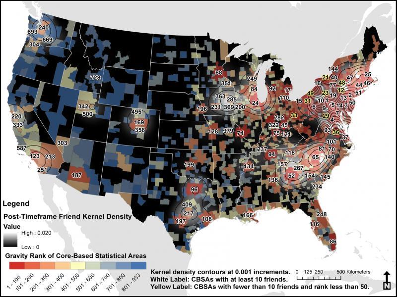 Individuals have fewer alters in red regions and more alters in blue regions over time, illustrating a shift toward coastal locales, North Carolina, and large cities in the West. Hot and cold spots are created using a kernel density function.