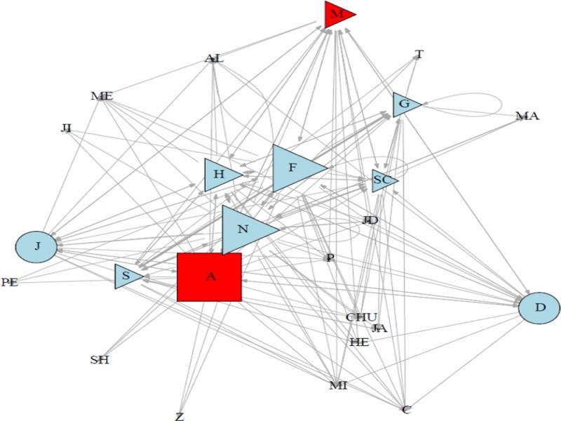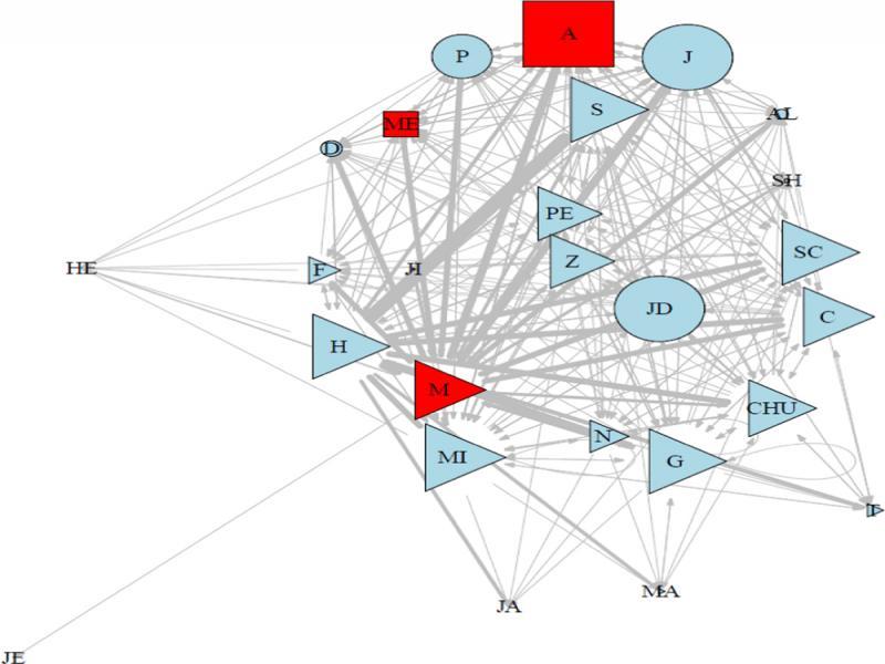 The formal communication networks by gender, organizational affiliation, and outdegree centrality. Node size represents outdegree centrality with larger nodes having higher outdegree and node color gender [red = female, light blue = male]. Node shapes represent organizational affiliation [square = owner, circle = architect/engineer, triangle = general- or sub-contractor]. Edge thickness represents communication frequency. Layout algorithm is Kamada-Kawai.