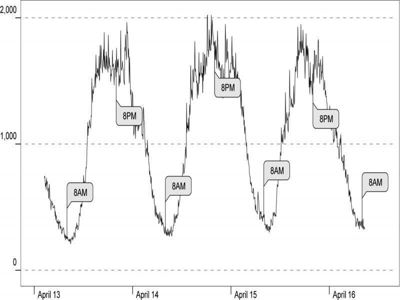 We retrieved all publicly available tweets and user information from April 13, 2020, 08:00:00 AM, to April 16, 2020, 07:59:59 AM, GMT (UTC +0), using the Twitter API with the query “contains: #COVID19 and country code: USA and language: English.” This time period was chosen because the U.S. became the nation with the highest number of deaths due to COVID-19 on April 12 and it was predicted the highest U.S. daily death rate would occur on April 15. We selected 8 AM (instead of midnight) as the temporal boundary between days because the number of tweets started increasing around 8 AM and reached its peak around 8 PM each day. Figure 1 shows the distribution of the tweets that used #COVID19 during the study period. The Twitter users’ usernames, tweets, hashtags, retweet and mention relationships and self-descriptions were collected. We did not include replies to reduce the likelihood of repetition, losing context information, or producing unreliable data caused by Twitter’s new feature, “hide reply.”