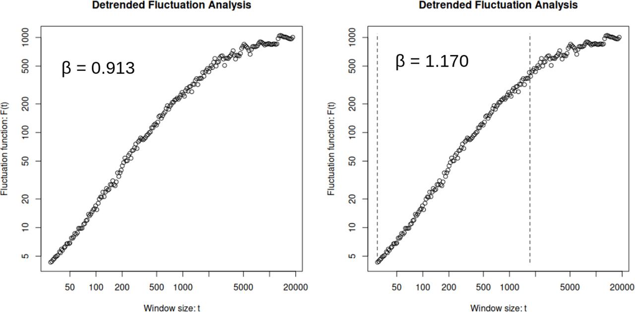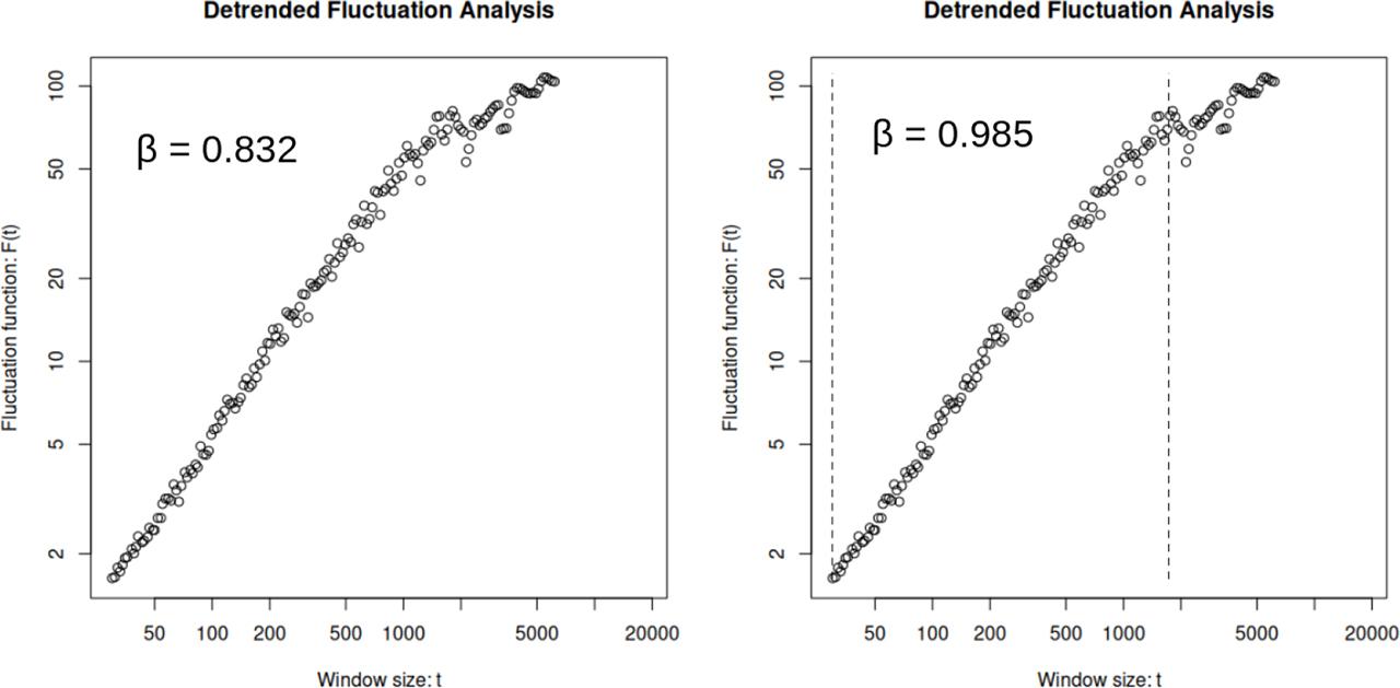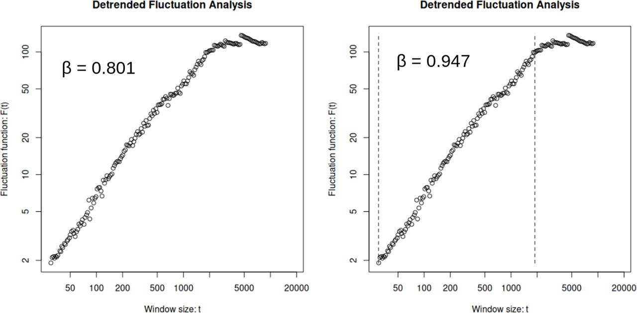 DFA (Peng et al., 1992) method is widely used for discovering fractal properties of time series by determining the statistical self-affinity of a signal. As the name suggests, the time series is detrended globally by integrating it, before dividing it into “windows” of equal size t. This process is repeated for a range of different values of t, resulting in different number of windows. For each value of t a standard least squares line is fit to the data, which allows for computing the size of the fluctuation F(t) for every window individually. Usually, F(t) increases with t. While Aguilera et al. (2013) use the DFA results to calculate the Hurst exponent, an approximation of β in the spectral density function, which in turn is used to estimate β, as the relationship between the Hurst exponent and the spectral power content at different scales is β=2 * α-1, this article takes the more parsimonious approach of estimating β directly from the DFA results. As F(t) tβ, β can be estimated directly from the DFA results by regressing F(t) on t. The range of the regression is determined by the window sizes for which a linear relation in the log-log plot of t and F(t) holds true. The exponent of this regression is beta (Penzel et al., 2003).