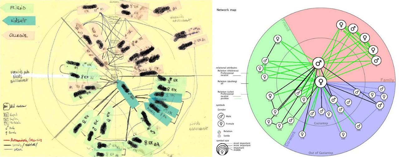 At left, anonymized personal network of an international (expat) aid worker made with paper, sticky notes and colored pencils. The inner circle is for ego’s household, the outer circles, which are inside out and in order, locate alters living in the same city, alters living in other cities in Turkey, and alters living elsewhere in the world, i.e. outside Turkey. The circles are divided into three parts: living, working and working-living environment. Alters are organized within three main categories of sticky notes, distinguished by color: friends in green, relatives in blue, working colleagues in orange. Then the interviewee was asked which alters are expats, Syrians or Turkish, their sex/gender, and whether they were aid-workers. The interview was audio-recorded. On the right is the same network from the left, but done in Vennmaker and simplifying some of the circle divisions to ease the placing of alters. Source: elaborated by first author.