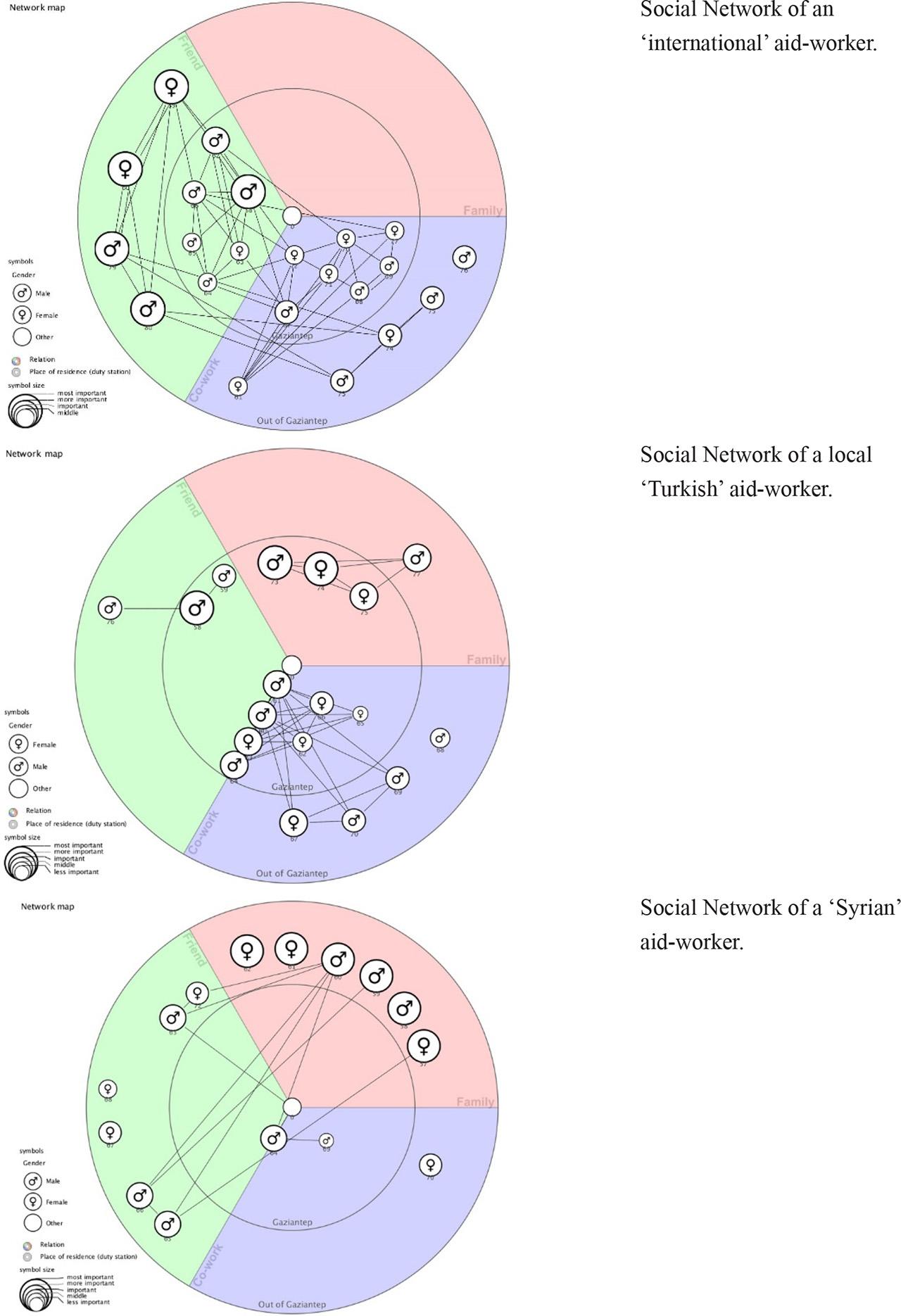 To provide a true picture of the interview while it is ongoing, the Vennmaker images below (Figure 2) are exactly those that interviewees visualized at the end of the interviews on their personal networks. They have not been edited to add extra information or to make the material more attractive for publication; only their names have been anonymized. As can be seen in the images below, the three categories of aid-worker had very different networks. The first network corresponds to an expat aid-worker who is well connected with friends (green) and co-workers (purple) both locally (inner circle) and internationally (outside circle), although she no longer has any connection with her family after many years working abroad. The second example shows the network of a Turkish aid-worker who lives with his close family and is already well connected locally with co-workers and friends. After three years working in this sector, he is starting to have contacts abroad, which motivates him to pursue a career as an international aid-worker in the future. The third network is of a Syrian aid-worker and refugee who fled Syria and started to work in the aid sector. Most of his family and friends are living in Syria or just fled as refugees to Europe, and he has only one close friend in the city, a co-worker.