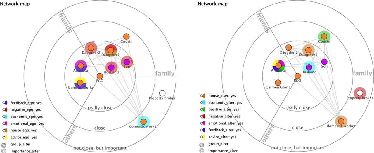 The main results of this research show how older people construct their social support networks during their life-course and how the structural aspects intervene through them, thereby increasing some of the basic inequalities that intersected with others, like gender, age, and socioeconomical level. Furthermore, it shows the social support networks as multilevel, multidimensional and longitudinal. Among the main results was the fact that the visualization of each represented network (as in Figure 3) helped the actors’ understanding and enabled them to give more support dimensions to ego, as well as the other way around. These graphs were complemented by the narratives behind each life history.