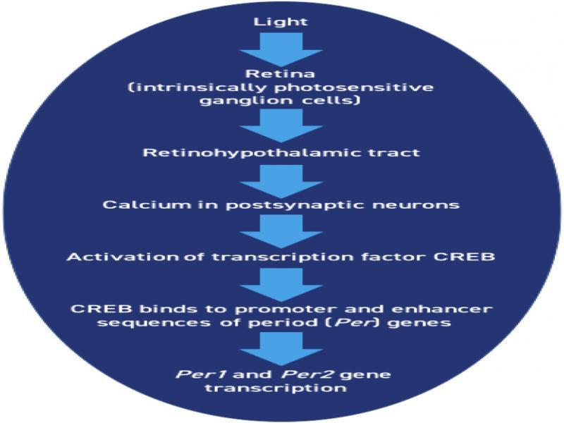 The non-visual pathway of light from the environment to the suprachiasmatic nucleus (SCN) and how it regulates the timing of the transcriptional/translational feedback loop (19). Once the light signal reaches the cells of the SCN, it is the induction of Per1 and Per2 gene expression that synchronises SCN timing with the environment.