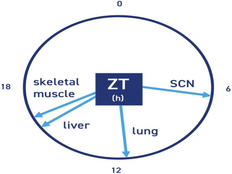 By measuring the timing of the acrophase (or peak) of clock gene expression researchers can compare the timing of different clocks within an organism. It has been demonstrated in mice that the Per1 expression acrophase occurs at different times in different tissues (56) with the acrophase occurring in the SCN at zeitgeber time (ZT)6.5, the lung at ZT11.8, the liver at ZT15.1, and skeletal muscle at ZT15.8 (Figure 2).
