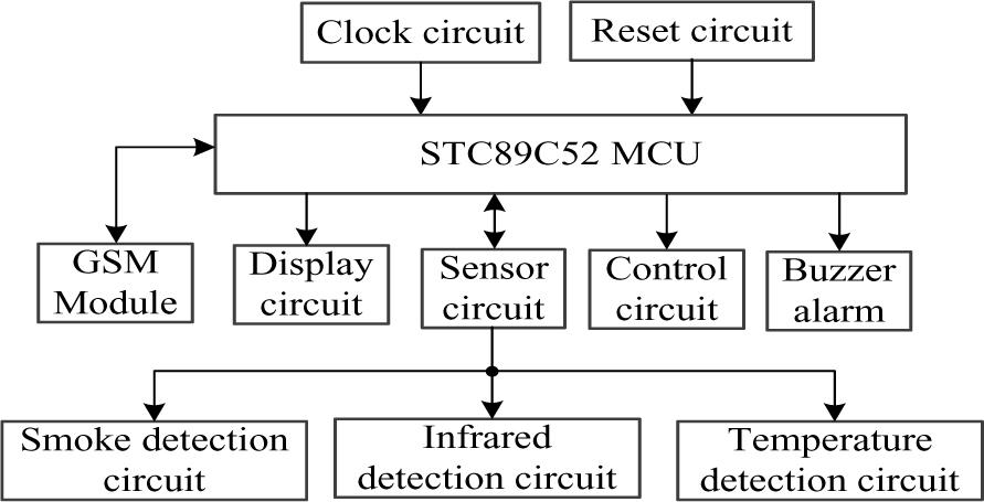 The hardware system is composed by the smallest system of MCU, the GSM module, the display circuit, the buzzer control circuit and the sensor circuit[3]. The sensor circuit is composed of three parts: the smoke detection, the human infrared detection and the temperature detection. It is showed in Figure 1.