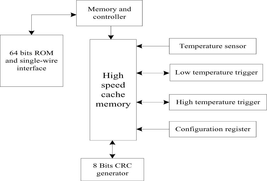 The DS18B20 consists of four parts: the 64 bits ROM with the single-wire interface, the temperature sensor, the temperature trigger and the configuration register. Its structure is shown in Figure 3.
