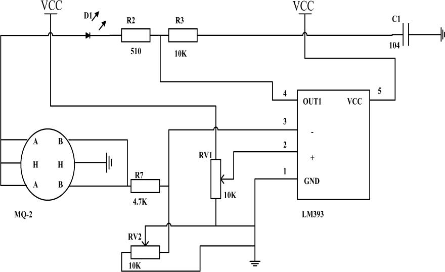 The MQ-2 is the smoke sensor. In MQ-2, R1 and RV2 constitute the circuit. RV1 is a sliding resistor which adjusts the input voltage of LM393. In general, when V+ >V-, outputs the high level. When the MQ-2 detects the smoke or the combustible gas, its resistance decreases and the voltage is smaller, the V-voltage changed higher, so that the V+<V-. The LM393 outputs the low level, the light emitting diode conducts. The single chip microcomputer detects the low level, so as to start the alarm.