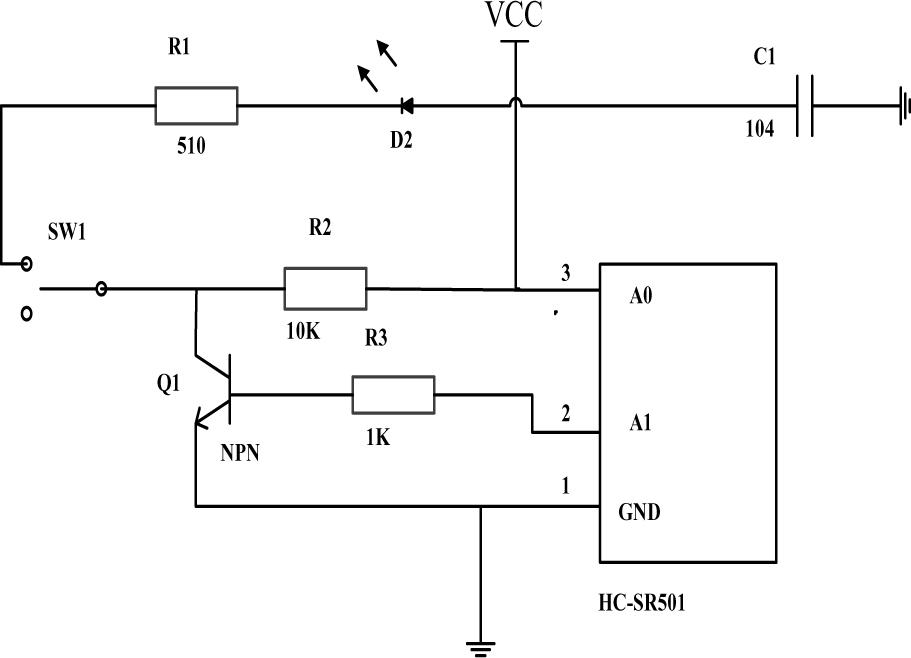 HC-SR501 is the human body induction module. When it detects the human body, pin A1 outputs the high level. Through the current limiting resistor, Q1 turns on and the collector connects to the GND and then switched to the low level. At this time, the light emitting diode conducts and the LED lighting. The single chip microcomputer detects the low level and begins an alarm. In the circuit, the capacitance used as the filter, R2 is the pull-up resistor. When there is no person, the Q1 turns off. The single chip microcomputer can detect the high level by the pull-up resistor.