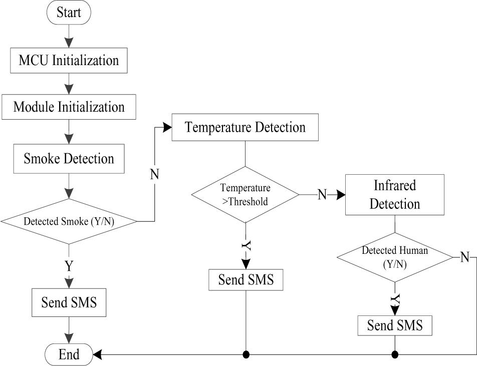 At first, the MCU initializes and then the temperature module, the human infrared module and the smoke alarm module are also initialized. If the system detects the smoke, sends the message to the mobile phone or determines whether the temperature exceeds the threshold value. If it exceeds it, send data to the user or judge the results of the human detected. If detects the human body sends the data to the mobile phone or not.